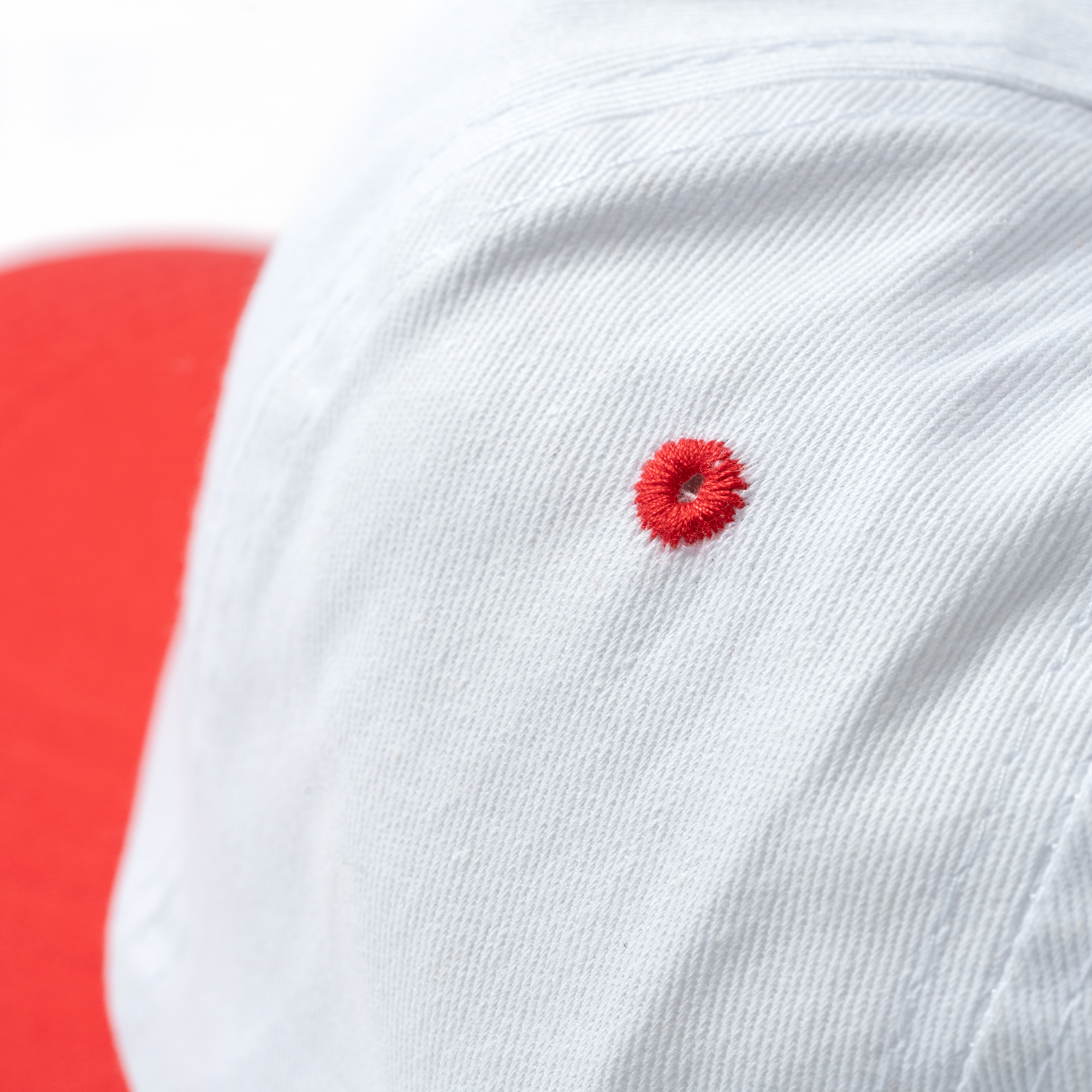 Gorra de 5 paneles 100% algodón. Con cierre ajustable de velcro y orificios de ventilación. Disponible en bicolor o color uniforme, con orificios bordados en color a conjunto.