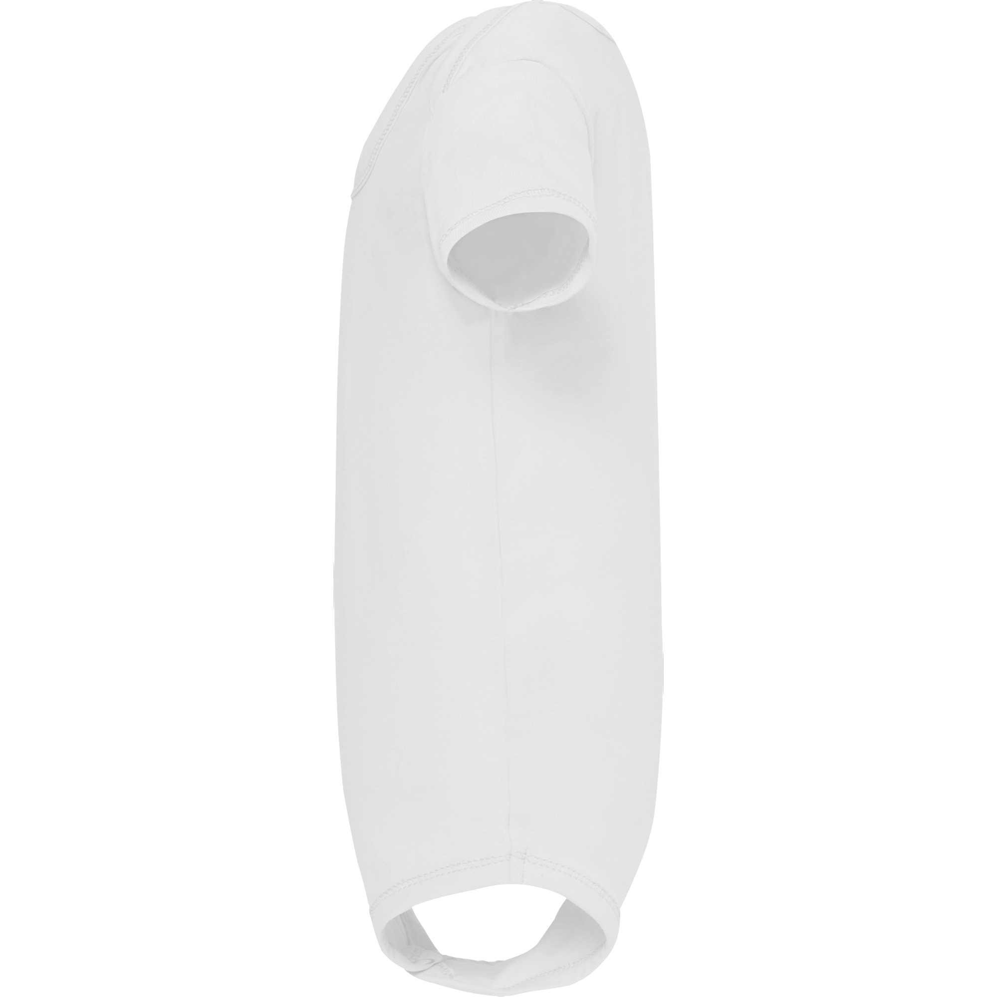 Body de bebé con manga corta de punto liso. Cuello redondo y bajo ribeteado en canalé 1×1. Cierre con botones a presión en la entrepierna. Hombro de apertura cruzada.