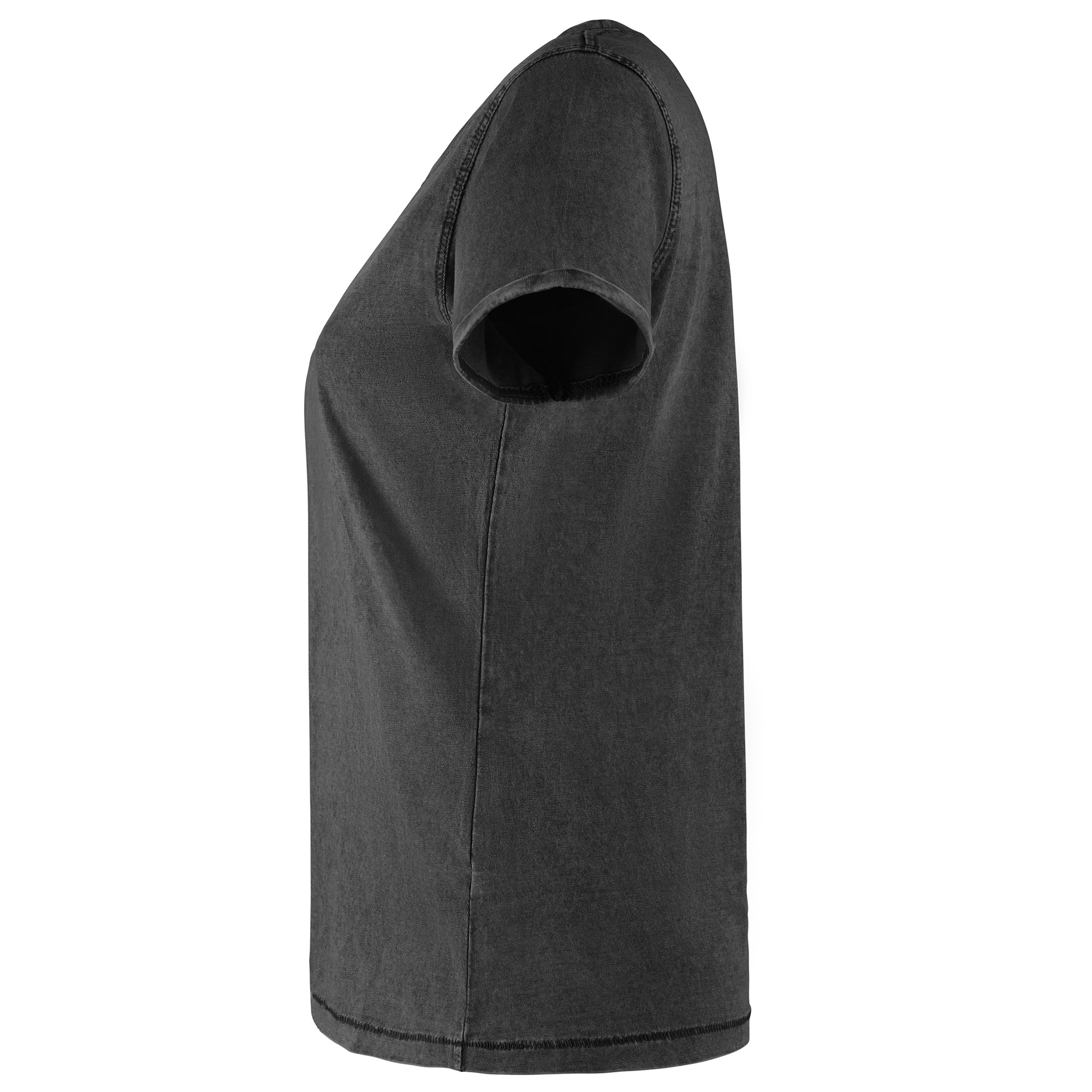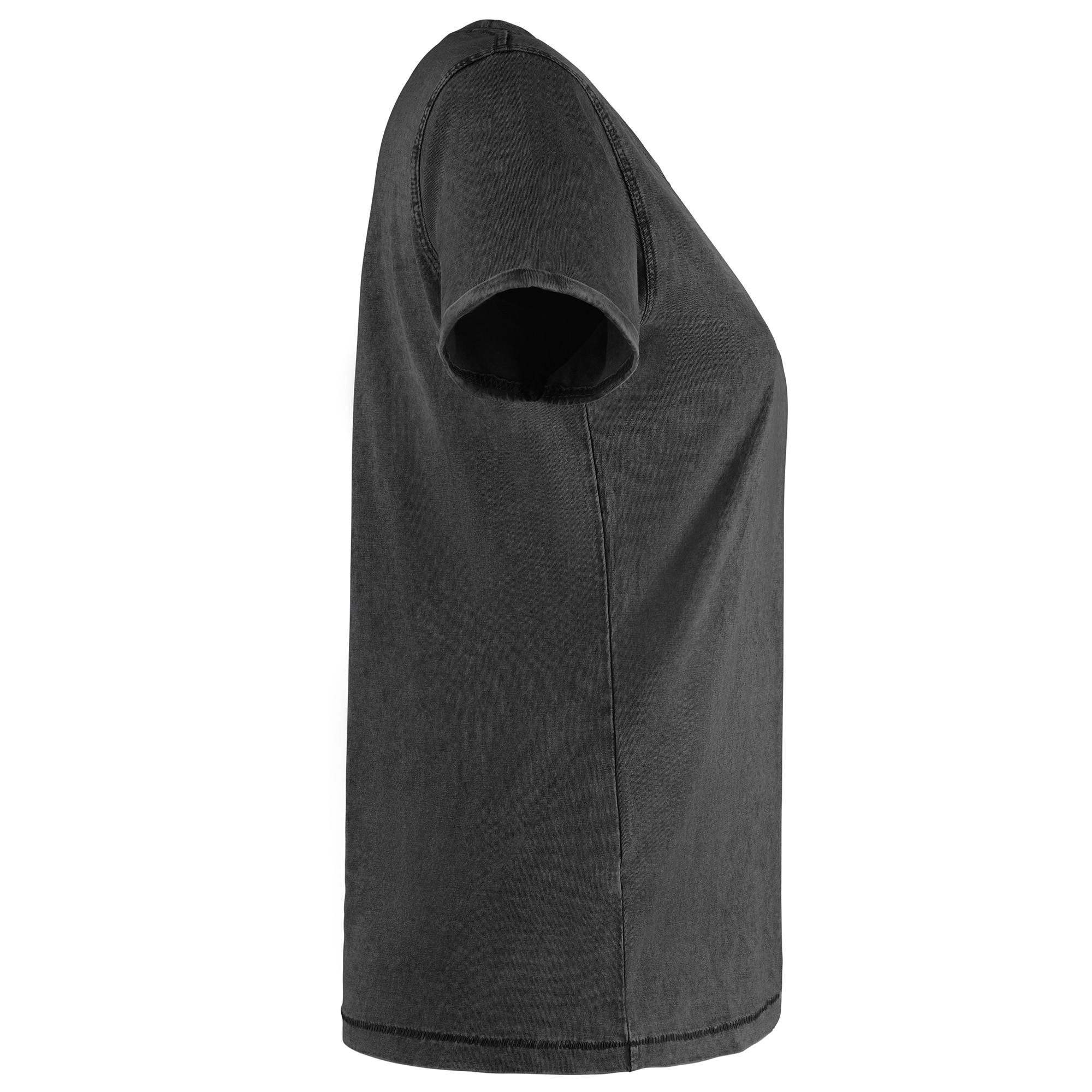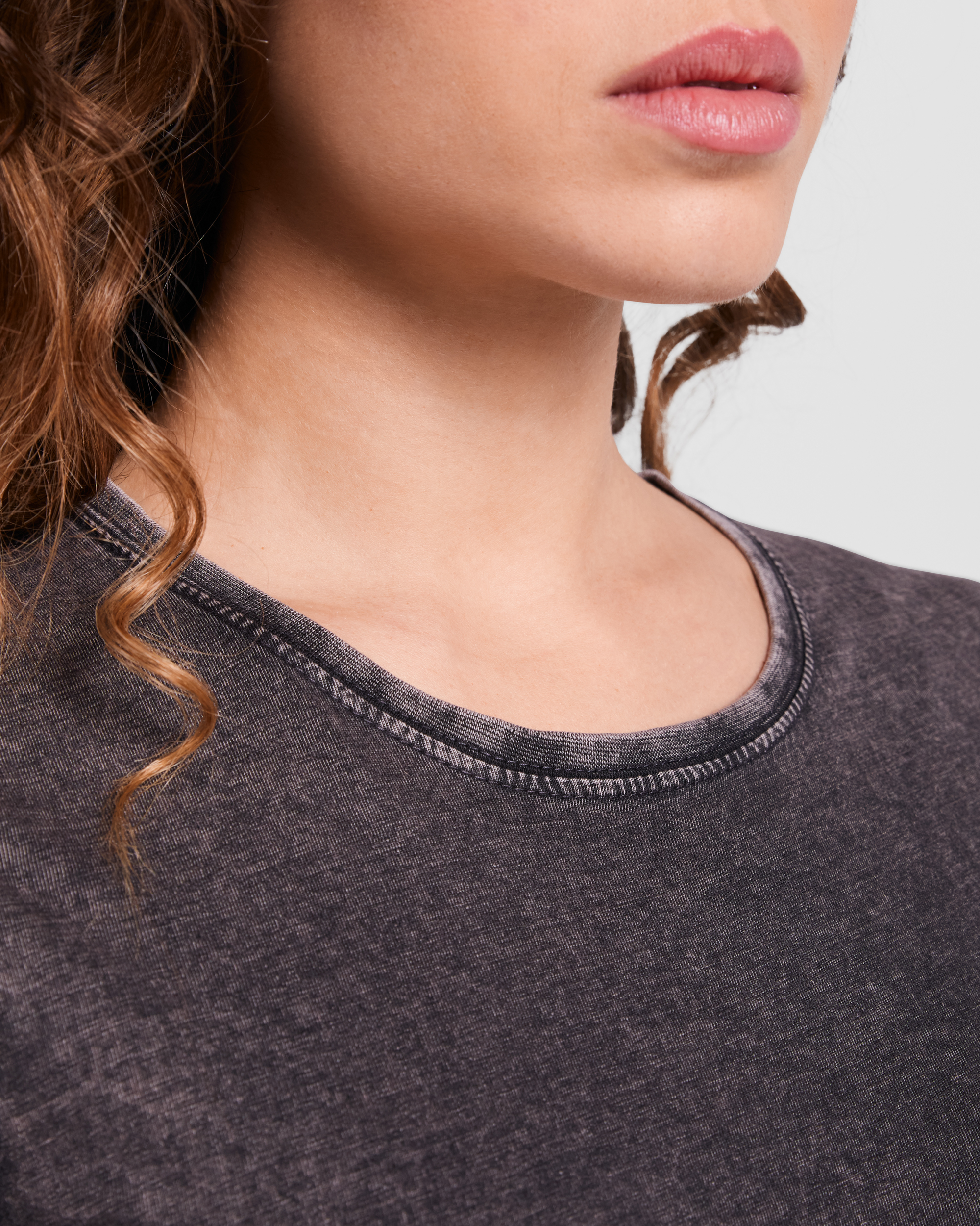 Camiseta de manga corta efecto jeans para mujer. Cuello fino redondo en canalé 1×1 con cubrecosturas de refuerzo de hombro a hombro. Doble costura en sisas. Apertura de manga con dobladillo.
