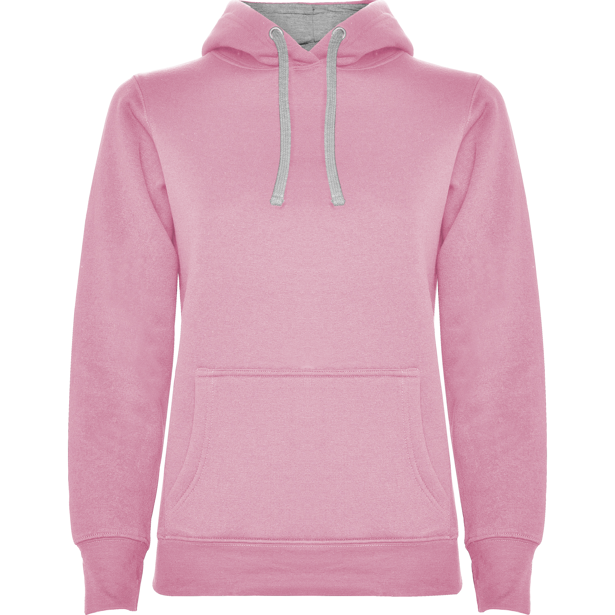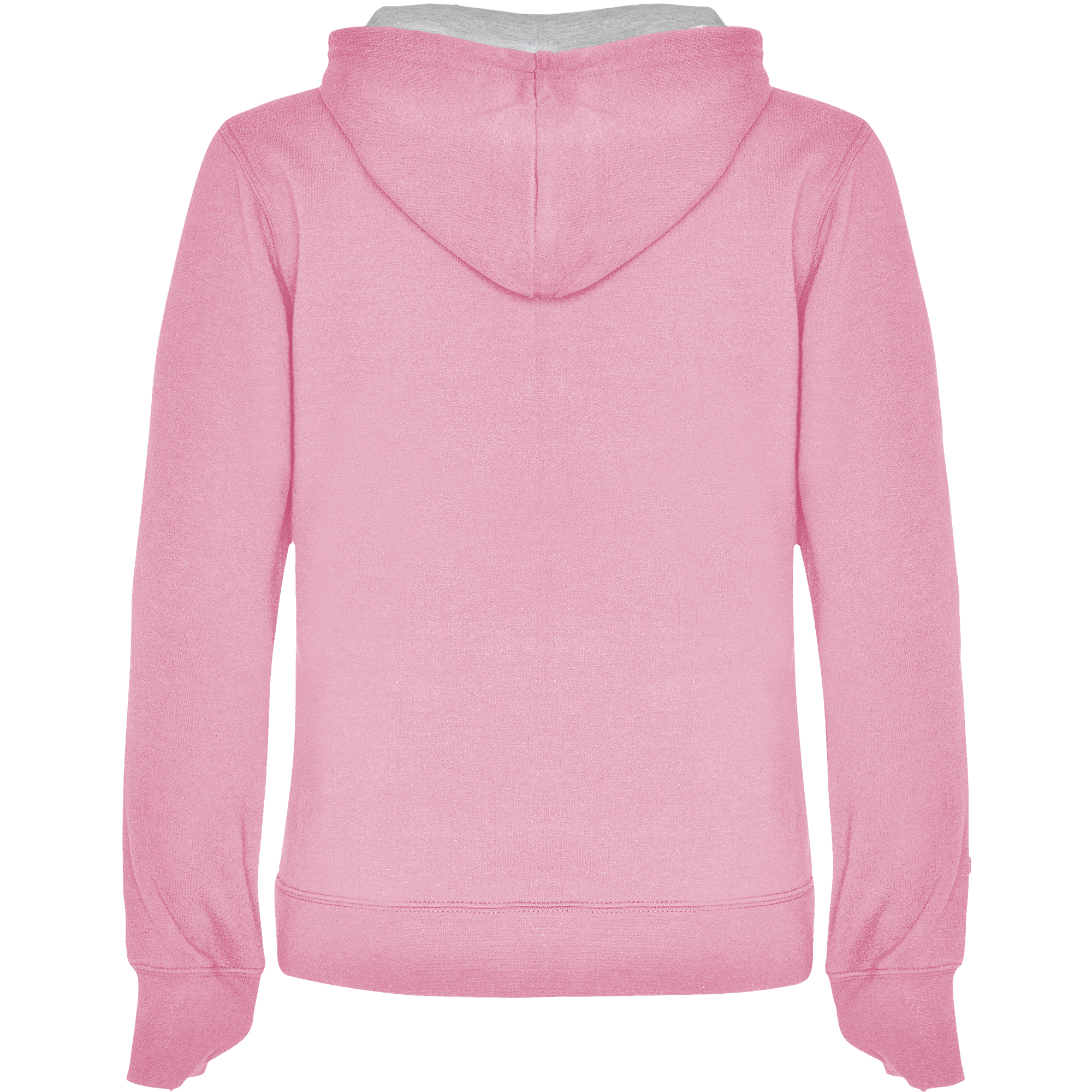 Sudadera entallada de corte femenino con capucha bicolor de doble tejido, con cordón contrastado ajustable, cubrecosturas en el cuello y bolsillo canguro. Punto canalé con elastano 1×1 en puños y cintura. Detalle thumb slit – puños con apertura para el pulgar.